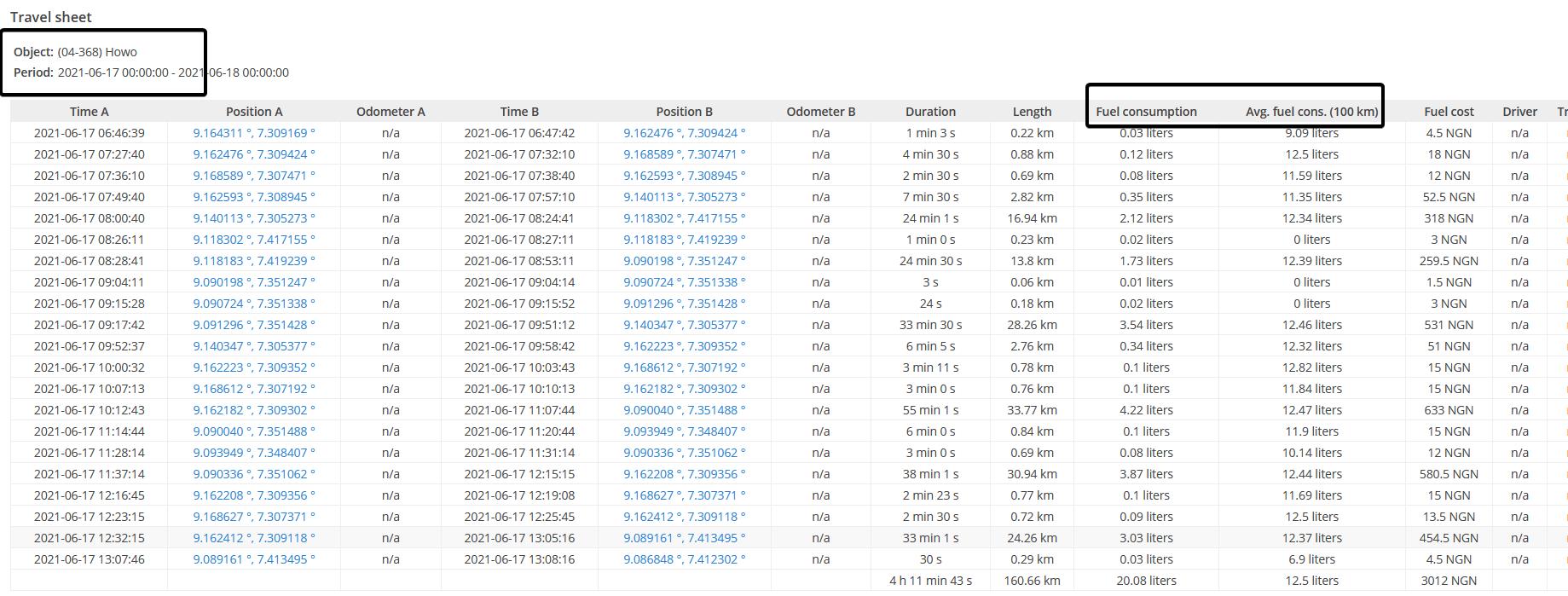 Below image shows Travel Sheet that include travel duration, length, Fuel Consumption, Average Fuel Consumption and Fuel Cost![]()